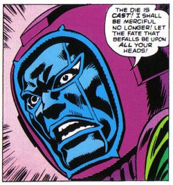 Next, Cap and Quicksilver pout into Kang's control room, eager to do battle, but Kang employs a force screen which pops up in front of Quicksilver, knocking him down, then using his Molecule Expander to increase the size of Cap's shield ten-fold and dropping it on top of him. As Ravonna looks on, Kang ups the ante on his foes and uses his Spectro Wave to deliver the knockout blow to the Avengers duo. With their defeat, Kang demands Ravonna's answer: will she marry him, or will he deliver on his threat to annihilate her kingdom. As Kang's massive army waits outside the city limits, Ravonna's father offers the wisdom that perhaps she should sacrifice herself for her kingdom.