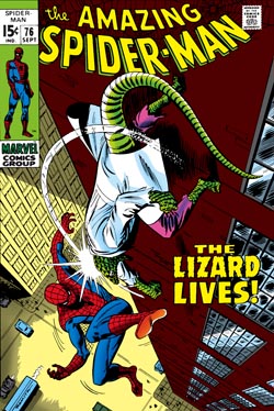 The next morning, the TV news trumpets the rampage of the Lizard. Spider-Man tries to track him down while swinging through the city, but the Lizard sneaks up and snaps his web line with his tail, sending him falling to the streets below. Spidey rights himself and the fight is on, though Spider-Man realizes that the Lizard has every bit the strenth and speed that he's got. The Lizard throws Spidey off the top of the roof, but a thick line of web wraps around the green-scaled monster's head and he pulls himself back up to the rooftop. The Lizard pulls the webbing off in time and slams Spider-Man into the bricks.